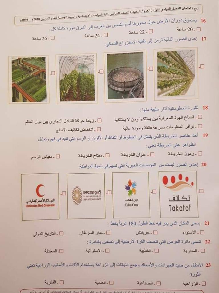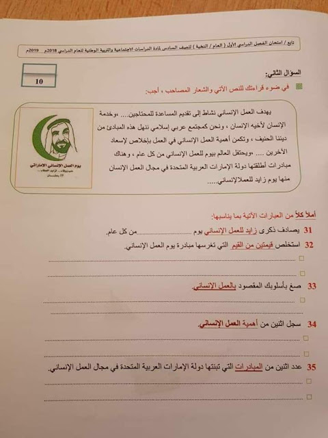 امتحان نهاية الفصل الاول, الصف السادس, اجتماعيات, الفصل الأول, 2018-2019 - المناهج الإماراتية