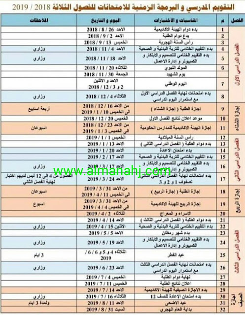معلومات الملف: التقويم المدرسي والبرمجة الزمنية للامتحانات للفصول الثلاثة 2018-2019 | ||