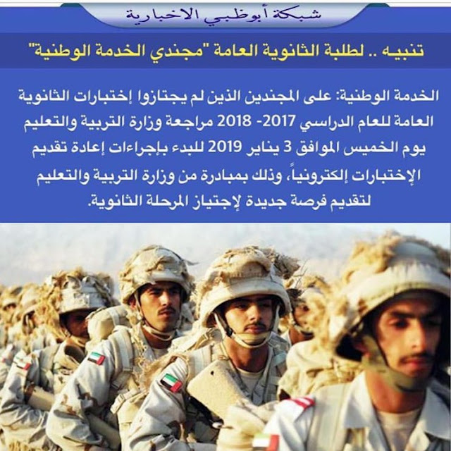 الخدمة الوطنية: على المجندين الذين لم يتجازوا اختبارات الثانوية العامة للعام الدراسي 2017-2018 مراجعة وزارة التربية والتعليم يوم الخميس الموافق 3 يناير 2019