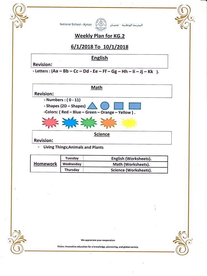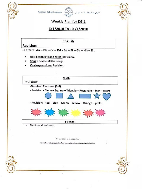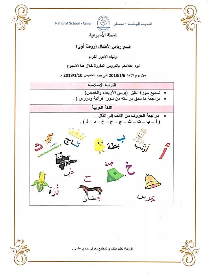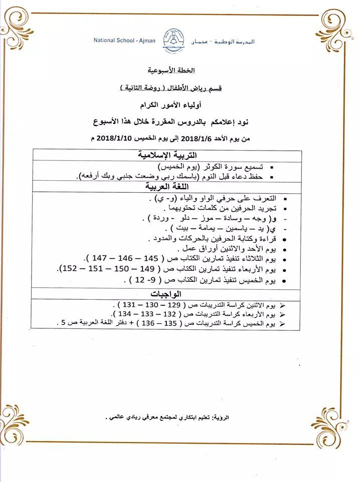 الخطة الأسبوعية / قسم رياض الأطفال في المدرسة الوطنية بعجمان من الأحد 6/1/2018 إلى الخميس 10/1/2018