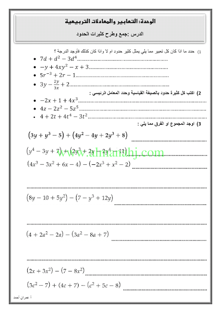 | اضغط هنا لتحميل وعرض ( ورق عمل جمع وطرح كثيرات الحدود ) | |||