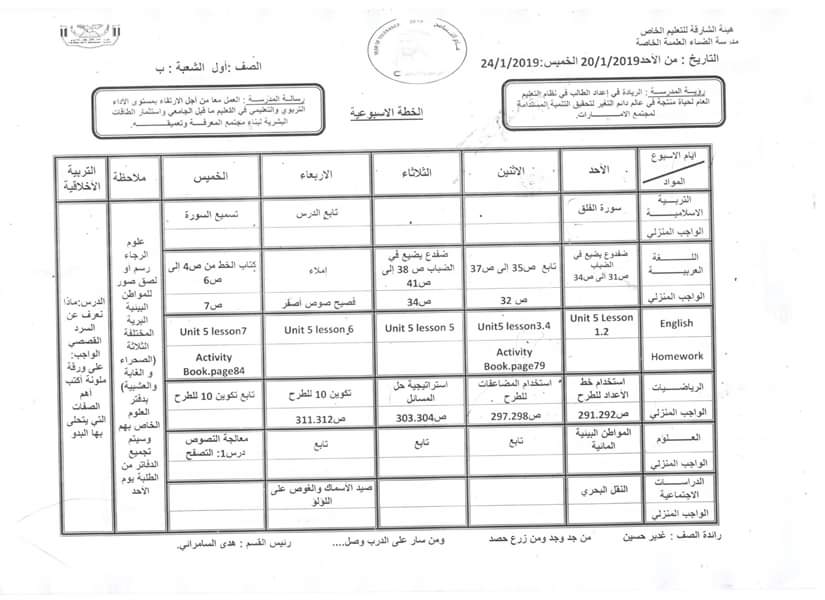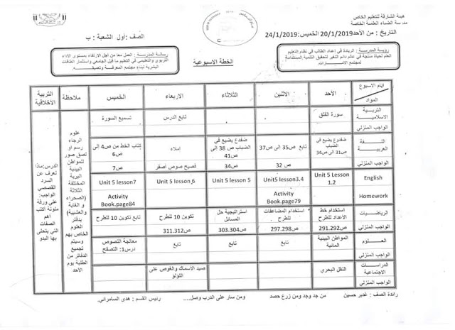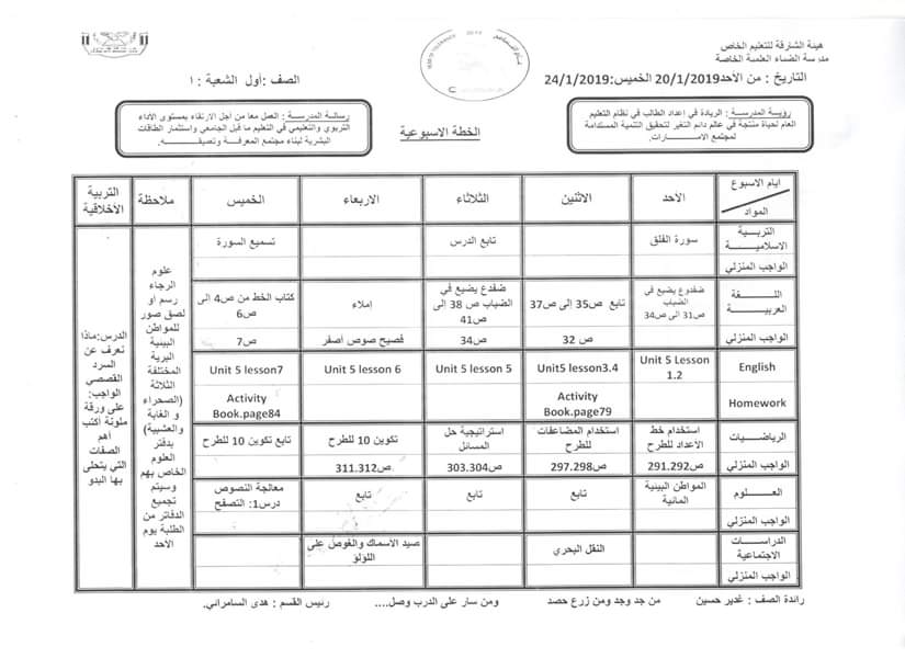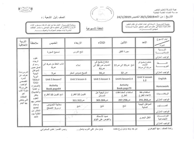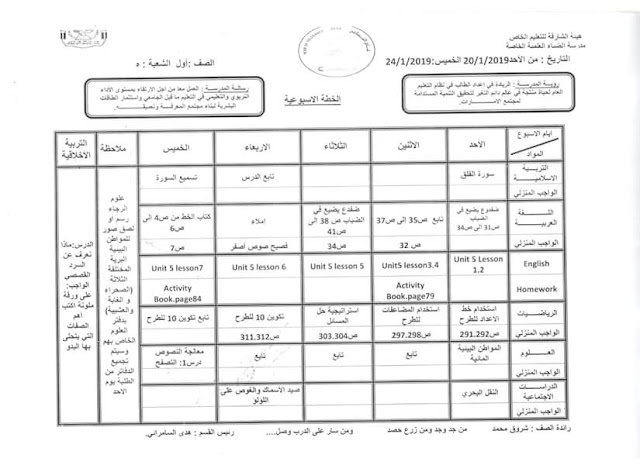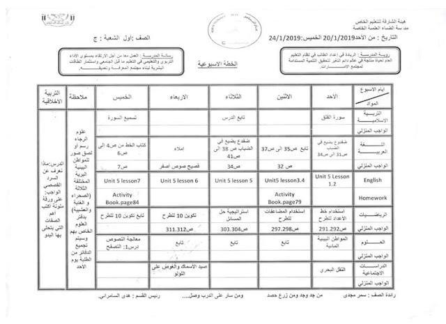 الصف الأول الخطة الاسبوعية من 20/1/2019 الى 24/1 /2019 مدرسة الضياء العلمية الخاصة