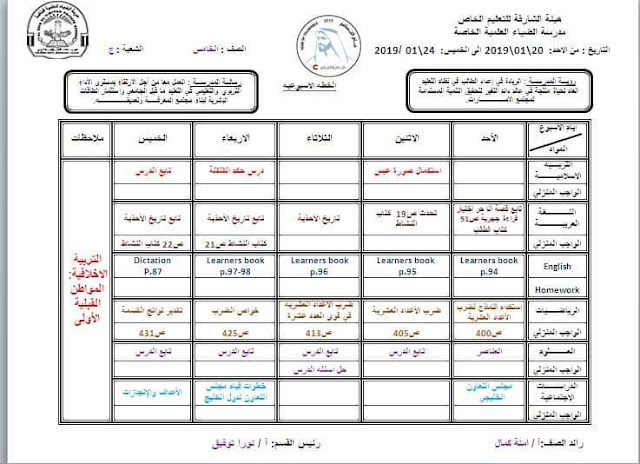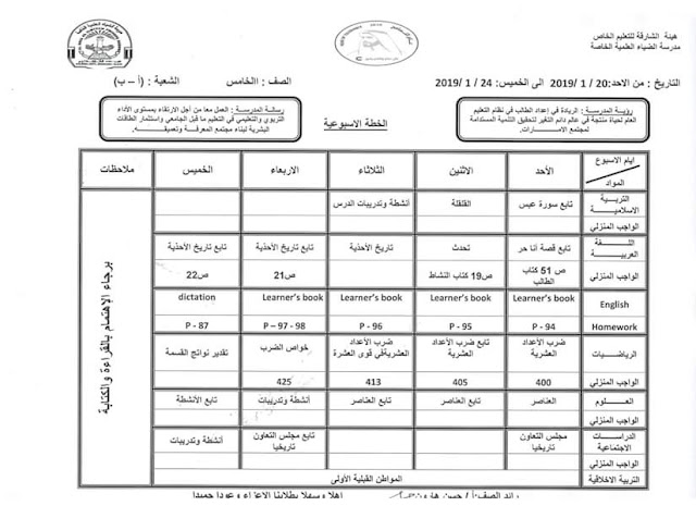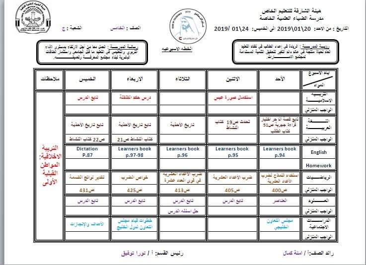 الصف الخامس الخطة الاسبوعية من 20/1/2019 الى 24/1 /2019 مدرسة الضياء العلمية الخاصة