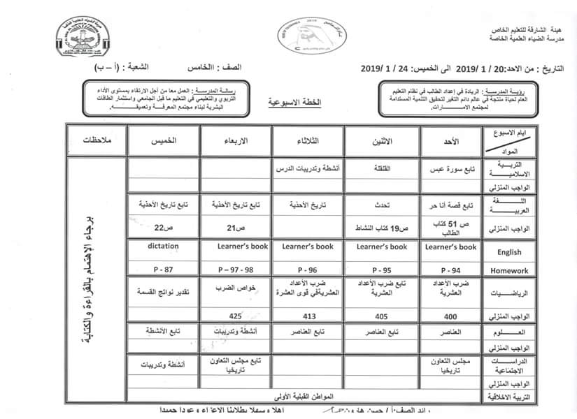الصف الخامس /الخطة الاسبوعية من 20/1/2019 الى 24/1 /2019 مدرسة الضياء العلمية الخاصة | ||
