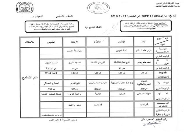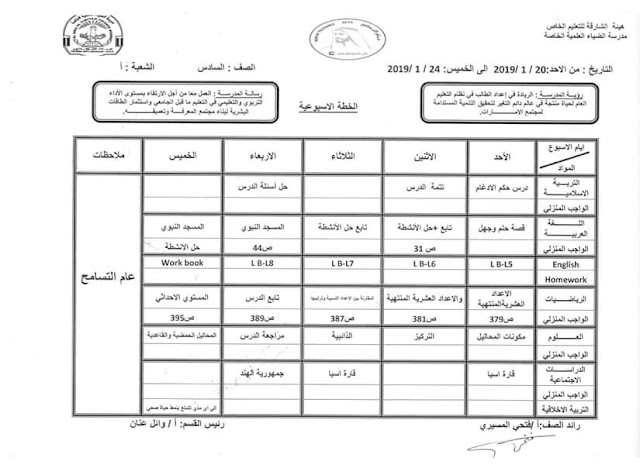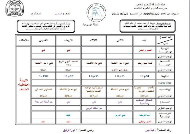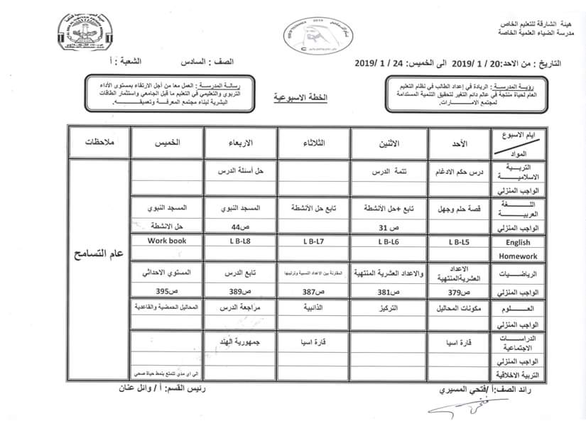 | الصف السادس /االخطة الاسبوعية من 20/1/2019 الى 24/1 /2019 مدرسة الضياء العلمية الخاصة | ||