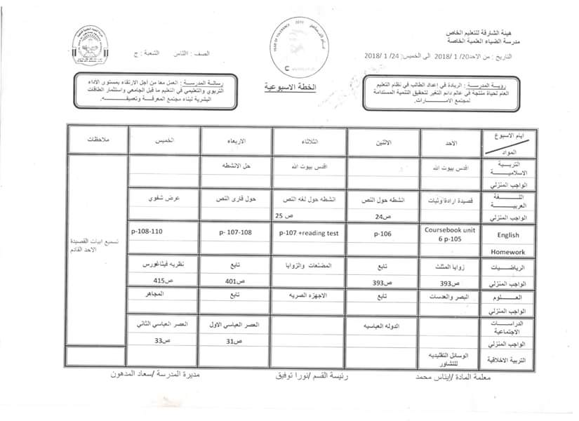 تفاصيل الخبر: الصف الثامن/ الخطة الاسبوعية من 20/1/2019 الى 24/1 /2019 مدرسة الضياء العلمية الخاصة | ||
