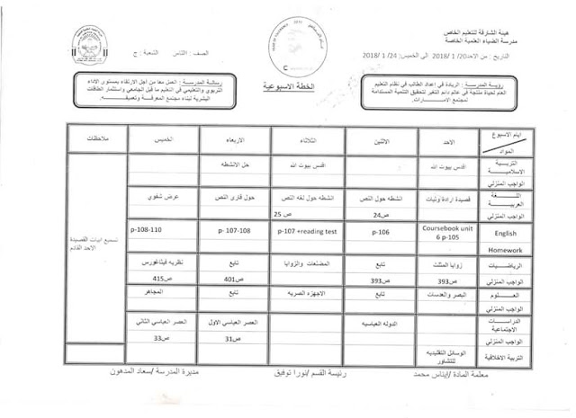 | الصف الثامن/ الخطة الاسبوعية من 20/1/2019 الى 24/1 /2019 مدرسة الضياء العلمية الخاصة | ||