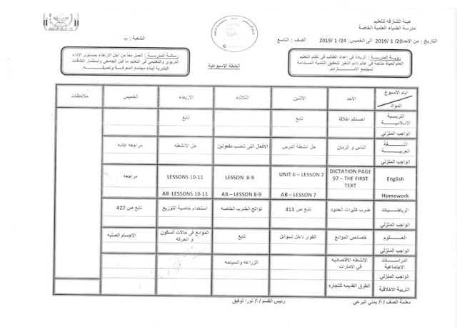 الصف التاسع الخطة الاسبوعية من 20/1/2019 الى 24/1 /2019 مدرسة الضياء العلمية الخاصة