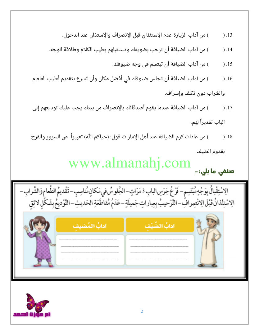 ورقة عمل اداب الزيارة والضيافة ورقة عمل ثانية | |||