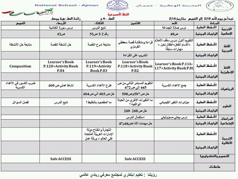 تفاصيل الخبر: الصف الرابع الخطة الاسبوعية من الاحد 10/2/2019 الى الخميس 14/2/2019 المدرسة الوطنية عجمان | ||