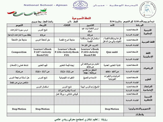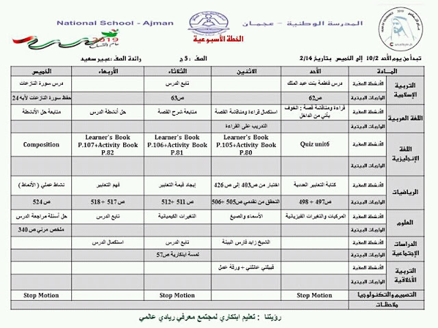 | الصف الخامس الخطة الاسبوعية من الاحد 10/2/2019 الى الخميس 14/2/2019 المدرسة الوطنية عجمان | ||
