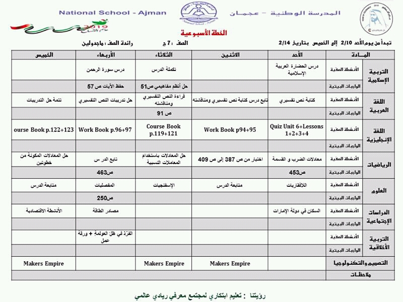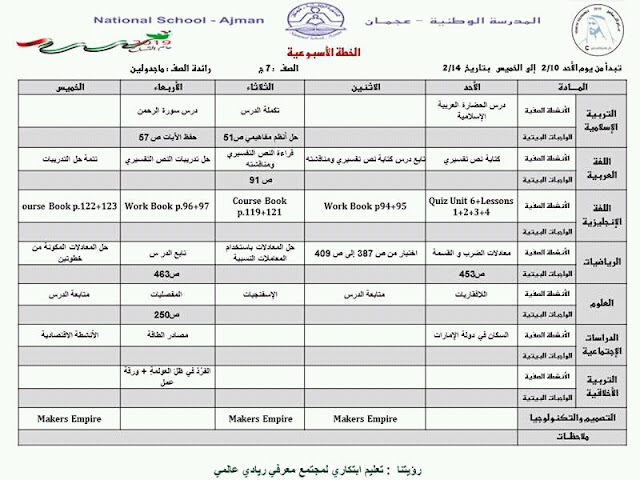 تفاصيل الخبر: الصف السابع الخطة الاسبوعية من الاحد 10/2/2019 الى الخميس 14/2/2019 المدرسة الوطنية عجمان | ||