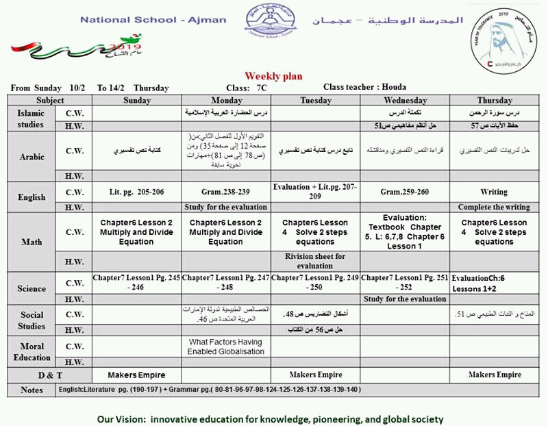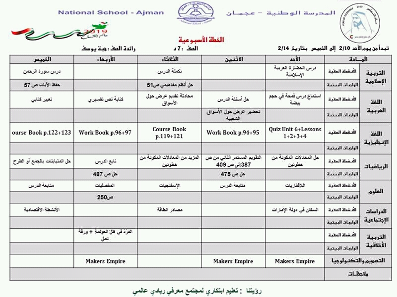 الصف السابع الخطة الاسبوعية من الاحد 10/2/2019 الى الخميس 14/2/2019 المدرسة الوطنية عجمان | ||
