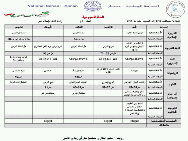 تفاصيل الخبر: الصف الثامن الخطة الاسبوعية من الاحد 10/2/2019 الى الخميس 14/2/2019 المدرسة الوطنية عجمان | ||