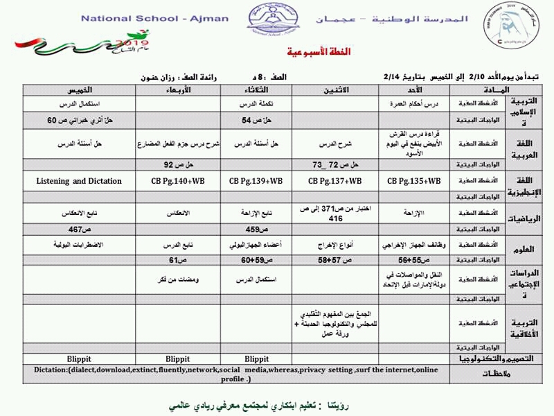 | الصف الثامن الخطة الاسبوعية من الاحد 10/2/2019 الى الخميس 14/2/2019 المدرسة الوطنية عجمان | ||