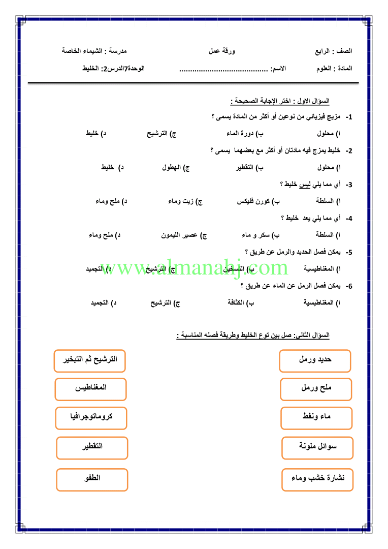 معلومات الملف: الصف الرابع, الفصل الثاني, علوم, 2018-2019, ورقة عمل درس الخليط | |||