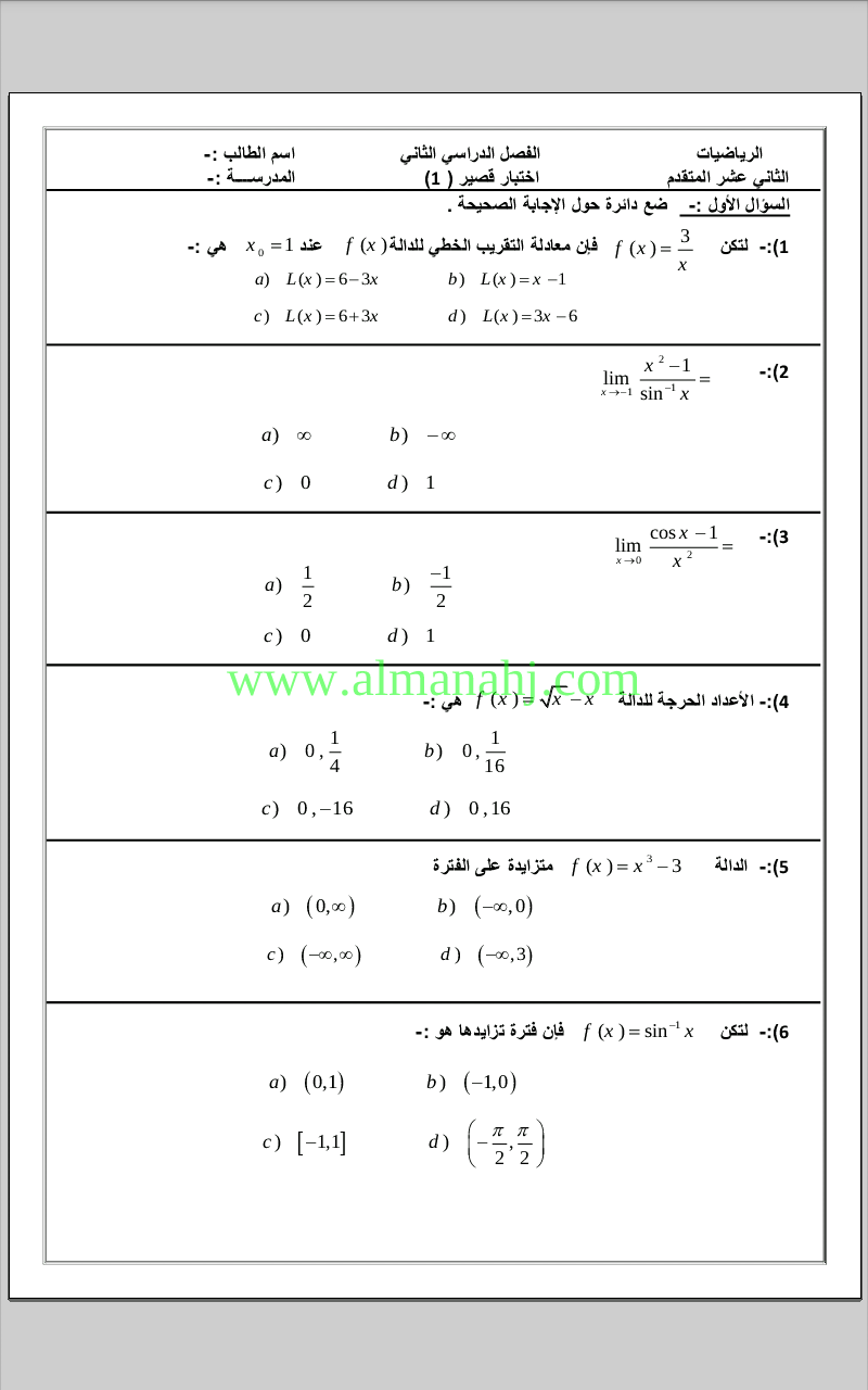 معلومات الملف: الصف الثاني عشر المتقدم, الفصل الثاني, رياضيات, 2018-2019, اختبار قصير أول | |||