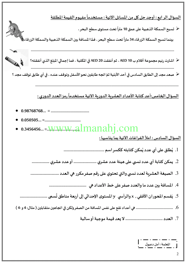 معلومات الملف: الصف السادس, الفصل الثاني, رياضيات, 2018-2019, ورقة عمل اولى مراجعة الوحدة 1 | |||