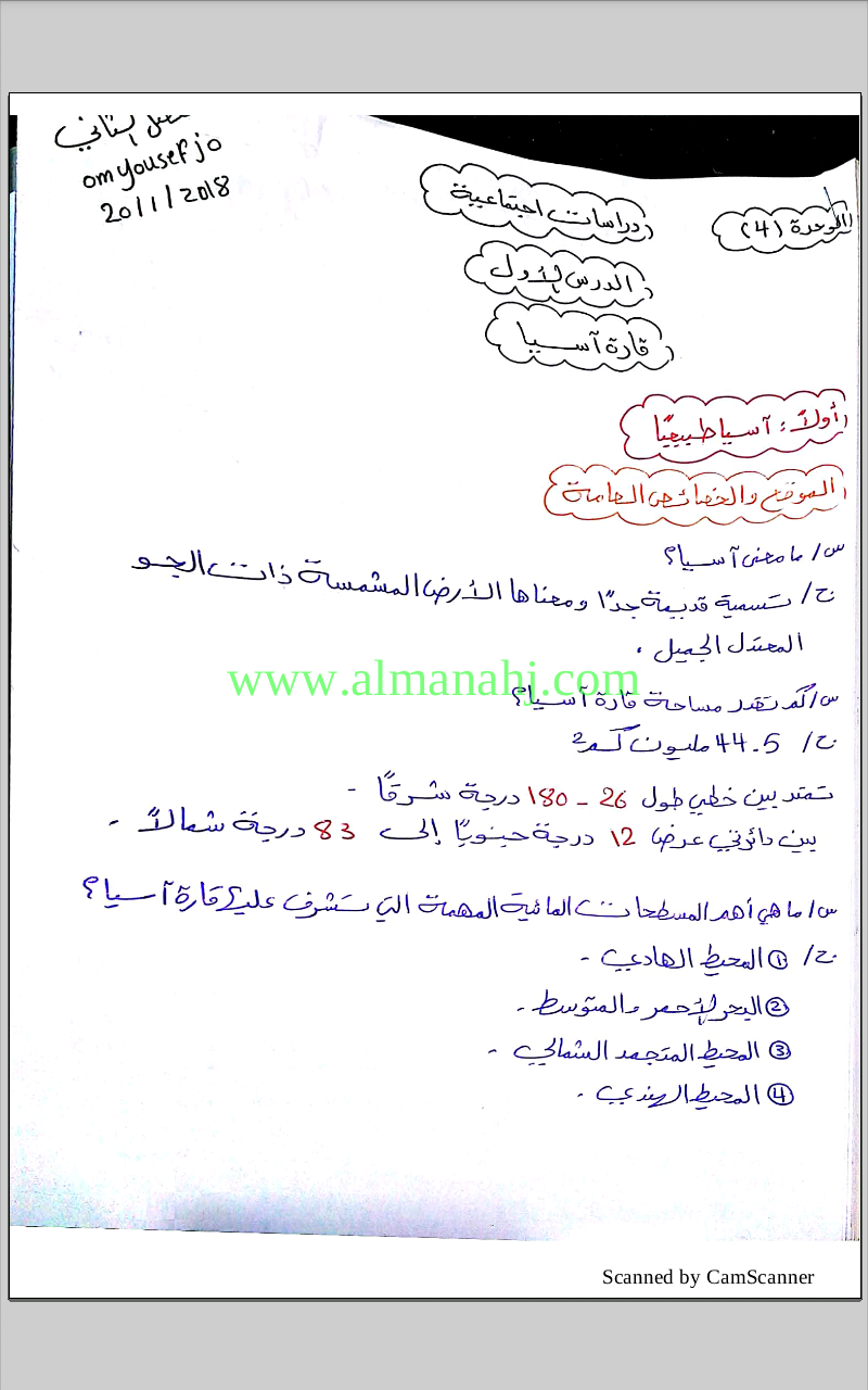 معلومات الملف: الصف السادس, الفصل الثاني, اجتماعيات, 2018-2019, تلخيص الوحدة الرابعة الدرس الاول قارة اسيا بخط اليد | |||