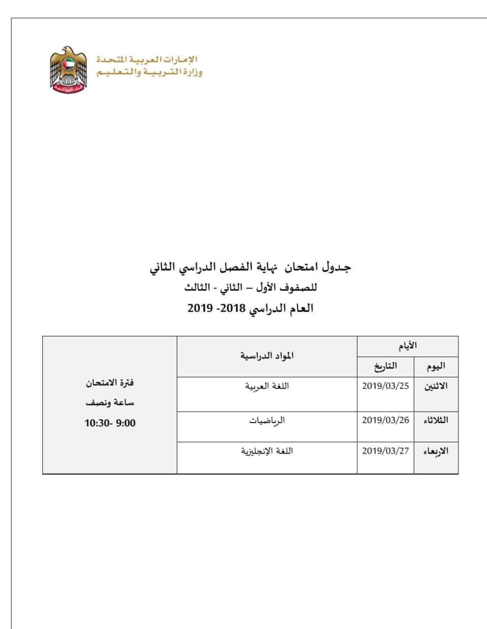 أعلنت وزارة التربية عن جداول امتحانات جميع الصفوف، للفصل الدراسي الثاني من العام الدراسي 2018/2019 ،واليكم جدول الصفوف من الاول وحتى الثالث
