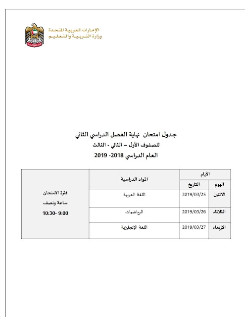 عاجل، جدول امتحان نهاية الفصل الثاني للصفوف الاول والثاني والثالث 2018\2019 | ||