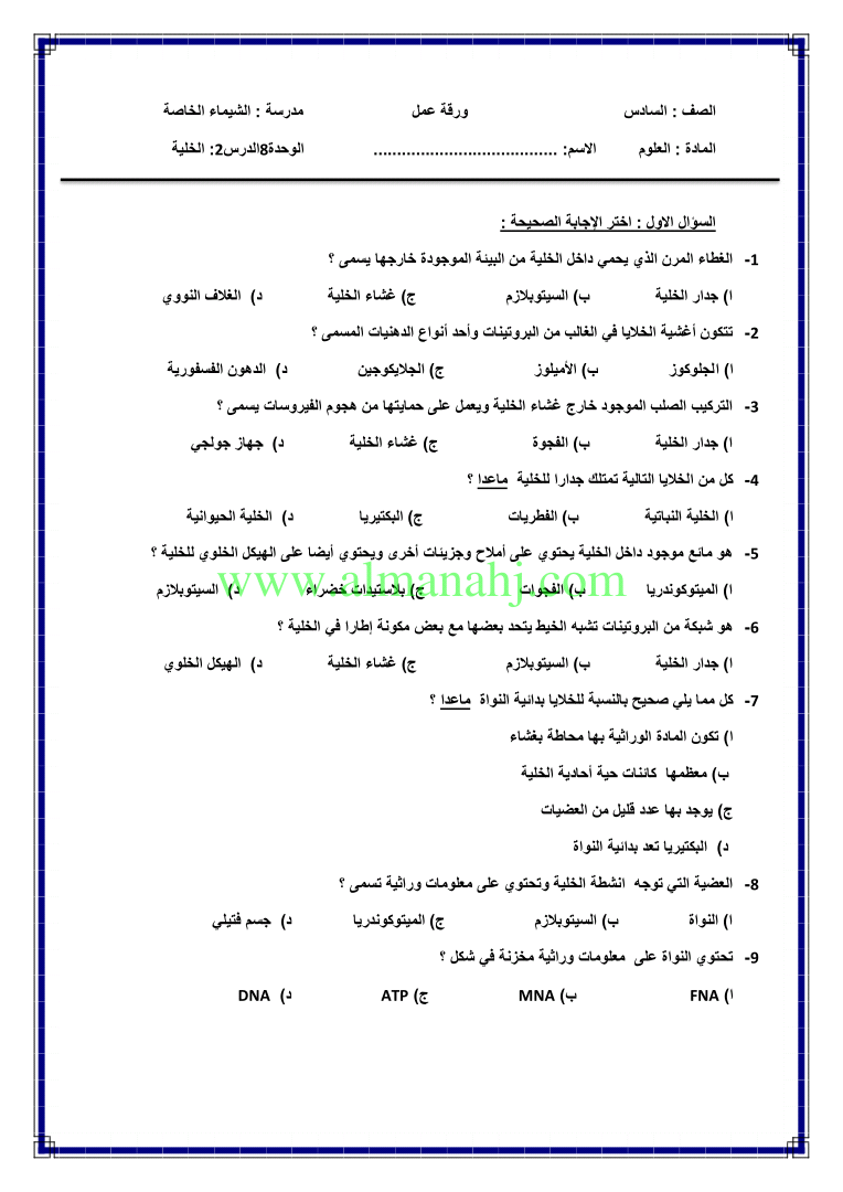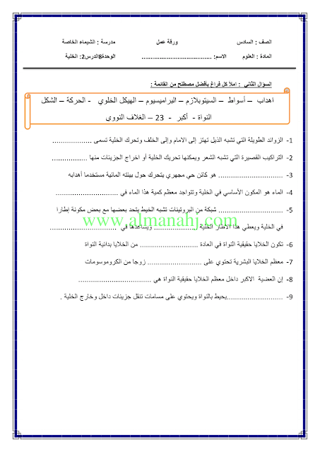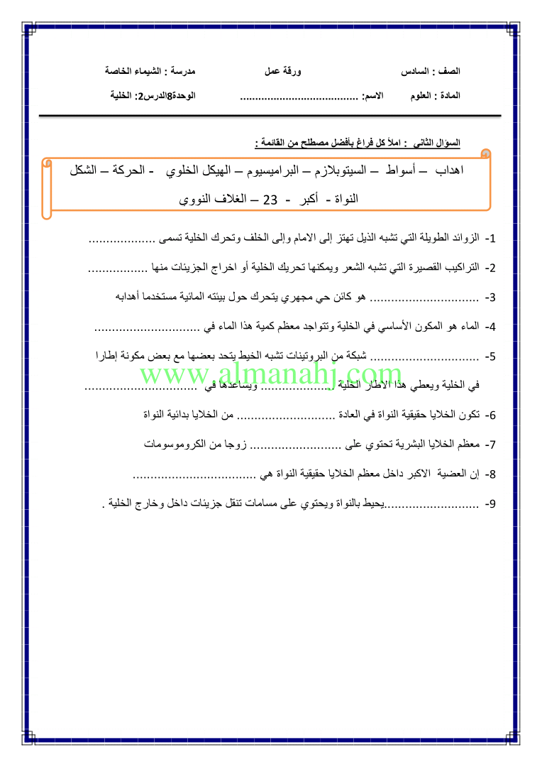 معلومات الملف: الصف السادس, الفصل الثاني, علوم, 2018-2019, ورقة عمل الوحدة8 الدرس 2 الخلية | |||