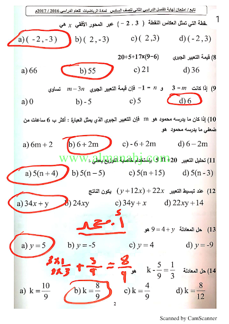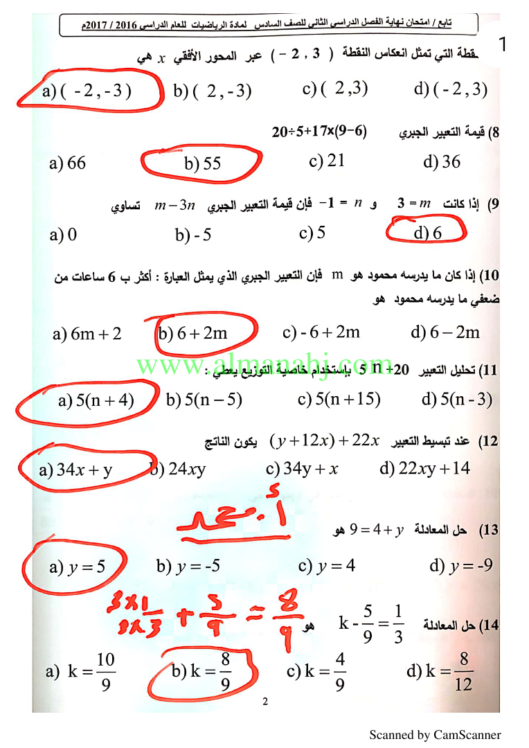 معلومات الملف: الصف السادس, الفصل الثاني, رياضيات, 2018-2019, حل امتحان نهاية الفصل الثاني 2016-2017 | |||
