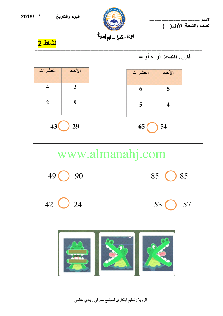 معلومات الملف: الصف الأول, الفصل الثاني, رياضيات, 2018-2019, نشاط ثاني استخدام الرموز لمقارنة الاعداد | |||