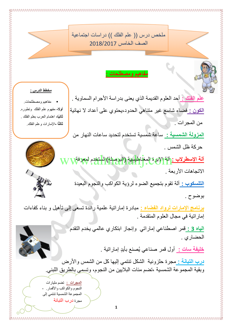 | الصف الخامس ملخص درس علم الفلك + حل الانشطة | |||