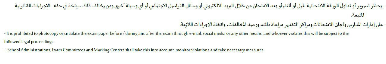 معلومات الملف: منعت وزارة التربية والتعليم للعام الثاني على التوالي تدوال أي أسئلة وزارية أو تصويرها قبل أو أثناء أو بعد الامتحان من خلال البريد الالكتروني أو أي وسيلة أخرى, ونحن في موقع المناهج ملتزمون بذلك ولن نقوم بنشر أي ملف أو أسئلة وذلك تنفيذاً لقرار وزارة التربية وحرصاً منا على مصلحة أبنائنا الطلبة. | ||