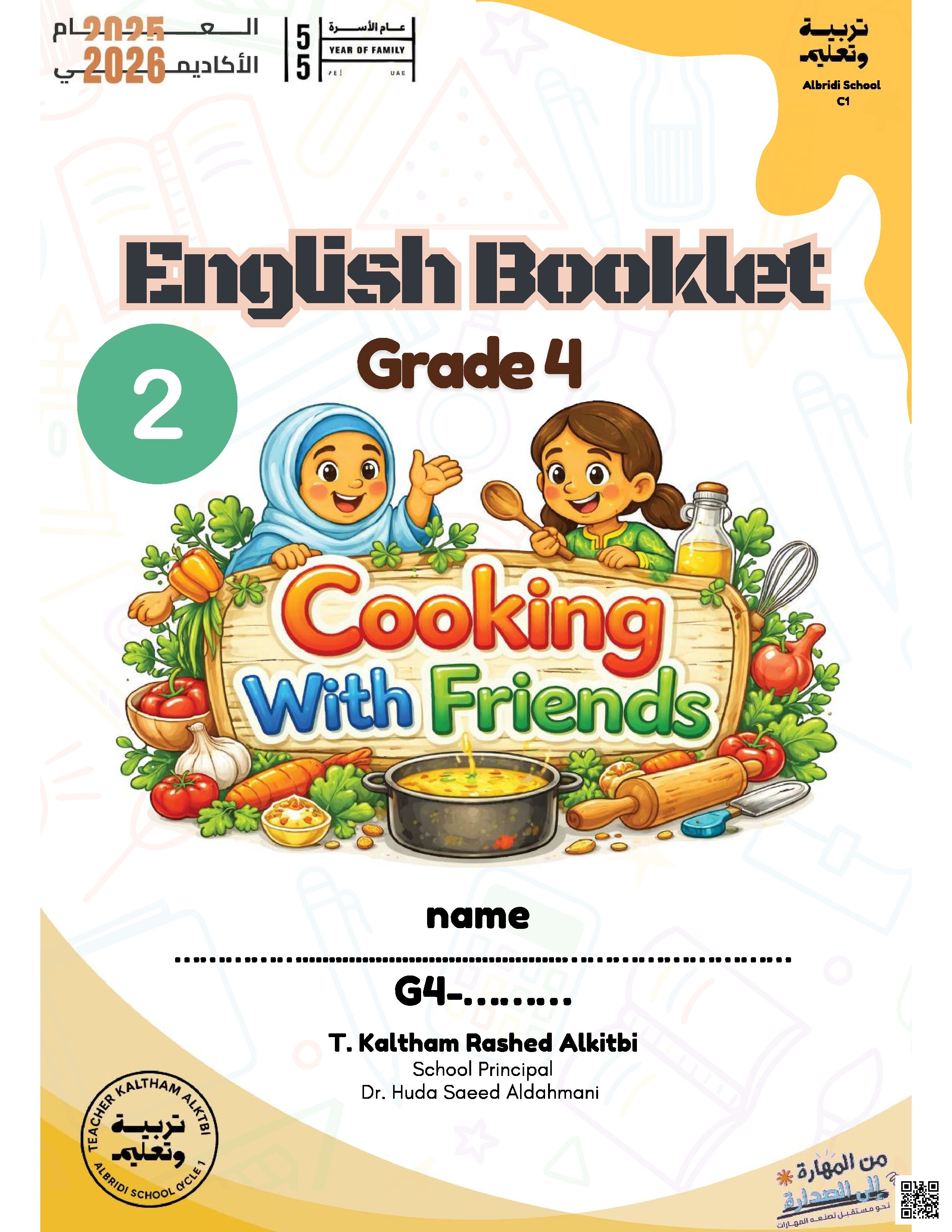 يحتوي الكتيب على تمارين لتعلم أفعال الطبخ (يغلي، يقطع، يصب، يمزج) مع كلمات عالية التكرار، ونصوص قرائية عن الأكل الإماراتي والعالمي، وتدريبات على كميات "a little" للمفردات غير المعدودة و"some" للمعدودة وغير المعدودة، بالإضافة إلى أدوات التسلسل (First، Then، Next، Finally) لترتيب خطوات تحضير الطعام. الأنشطة متنوعة وتشمل تصنيف الأغذية الصحية وغير الصحية، وترتيب جمل، وكتابة وصفات.