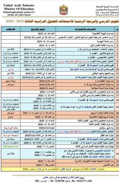 تعرف على التقويم المدرسي للعام الدراسي 2020/2019 لمدارس التعليم العام "الحكومية" والمدارس الخاصة المطبقة لمنهاج وزارة التربية والتعليم، والمعتمد من المجلس الوزاري للتنمية في شهر مايو 2018 . حيث يبدأ دوام الهيئة الأكاديمية في مدارس التعليم العام والمدراس المطبقة لمنهاج الوزارة في25أغسطس على أن يبدأ دوام الطلبة في الأول من سبتمبر المقبل, أما دوام الهيئة الأكاديمية في المدارس الخاصة المطبقة للمناهج الأجنبية في 26أغسطس 2019 بالنسبة لدوام الطلبة فسيكون في 1سمبتمبر 2019 , وفق المنهاج الإماراتي للعام الدراسي 2018/2019 ----- مع التمنيات لجميع الطلبة بالنجاح والتفوق. | ||