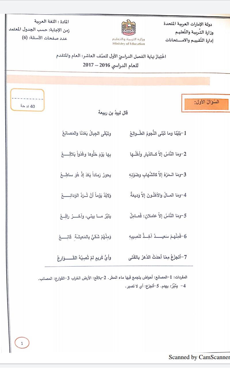 الامارات-الصف العاشر-لغة عربية- إمتحان نهاية الفصل الأول 2016-2017