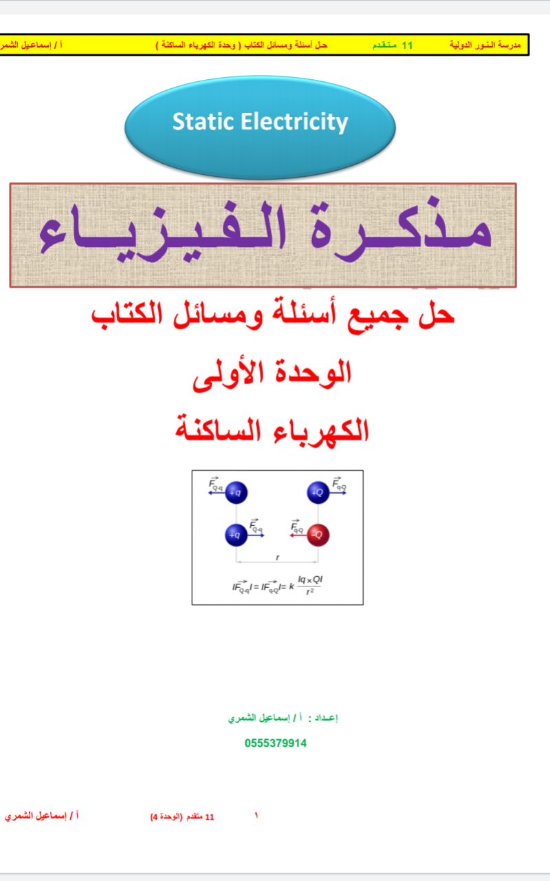 مذكرة فيزياء حل وحدة الكهرباء الساكنة - إعداد: إسماعيل الشمري | ||