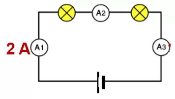 في دائرة التوالي، تكون شدة التيار متساوية في جميع أجزاء الدائرة. بما أن الأميتر الأول يقرأ 2 أمبير، فإن الأميتر الثالث سيقرأ نفس القيمة.