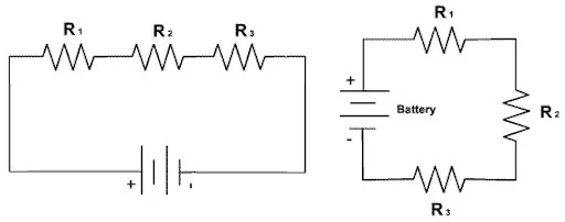 المكونات في الصور متصلة خلف بعضها البعض في مسار واحد للتيار، وهو ما يسمى بتوصيل التوالي.
