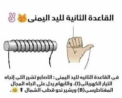 القاعدة الثانية لليد اليمنى تربط بين اتجاه التيار الكهربائي، واتجاه المجال المغناطيسي، واتجاه القوة المغناطيسية الناتجة.