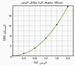 الرسم البياني لمسافة سقوط كرة مقابل الزمن يمثل منحنياً على شكل قطع مكافئ، والذي يتم التعبير عنه بالمعادلة التربيعية.