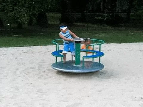 Linear velocity is calculated as \(v = r\omega\). Since both kids share the same angular velocity (\(\omega\)), the one at a greater radius (\(r\)) from the center has a higher linear velocity.