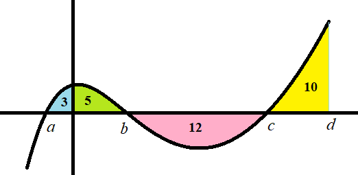 Using the areas of each region given, find \(\int_{a}^{d} f(x) dx\)