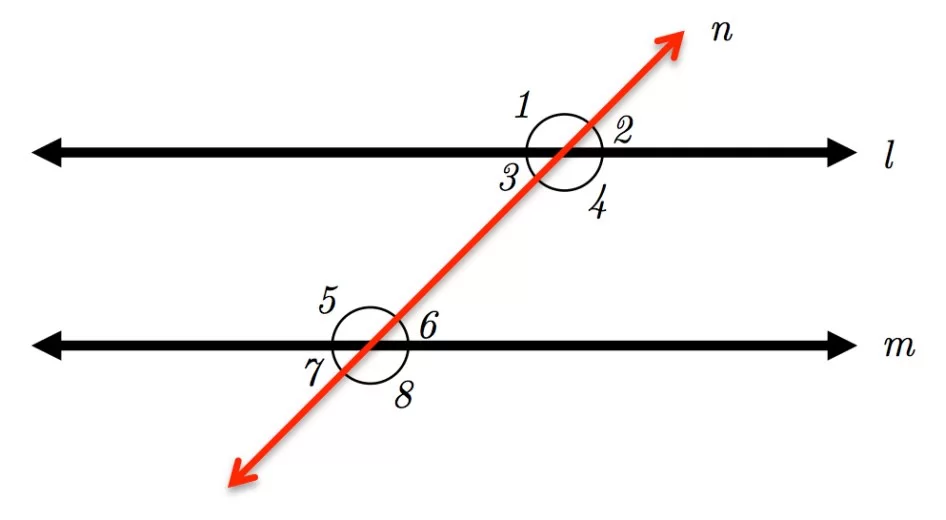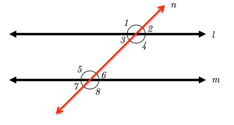 Angles 7 and 8 lie on line m and share a common vertex and arm, forming a linear pair. Linear pairs are always supplementary.