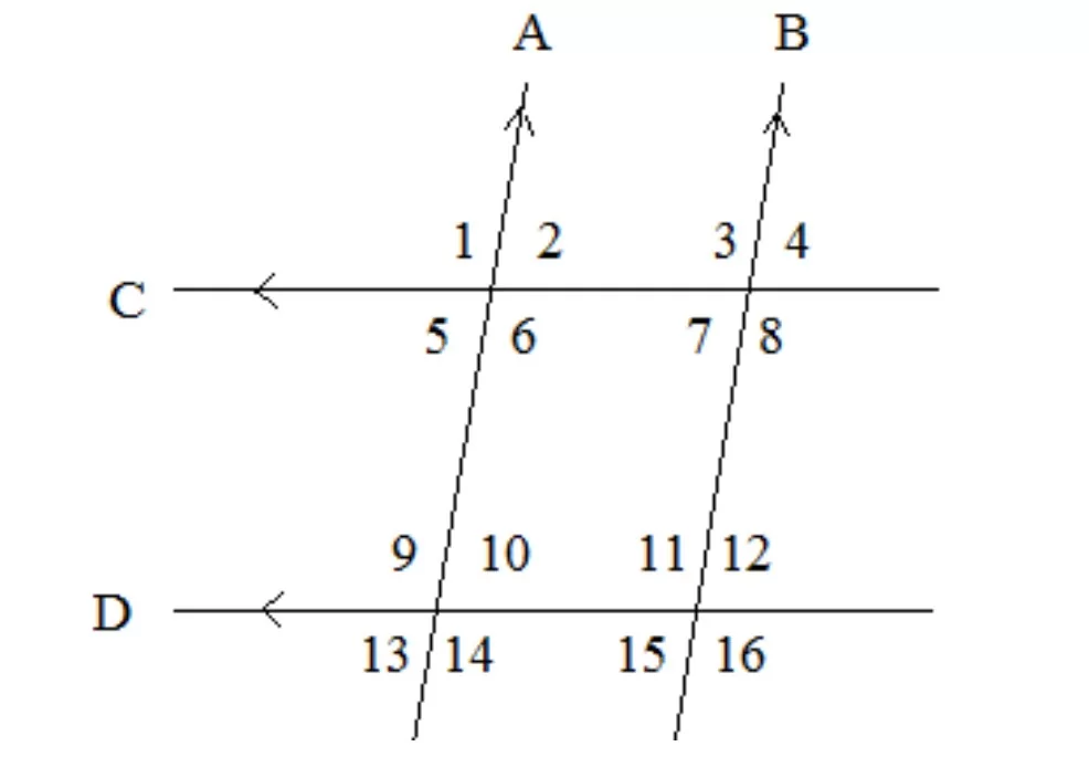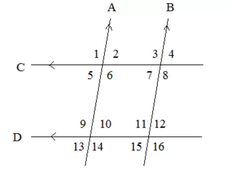 Based on the provided diagram, \( \angle 1 \) and \( \angle 9 \) are in the same relative position at the intersection of transversal A with lines C and D, making them corresponding angles.