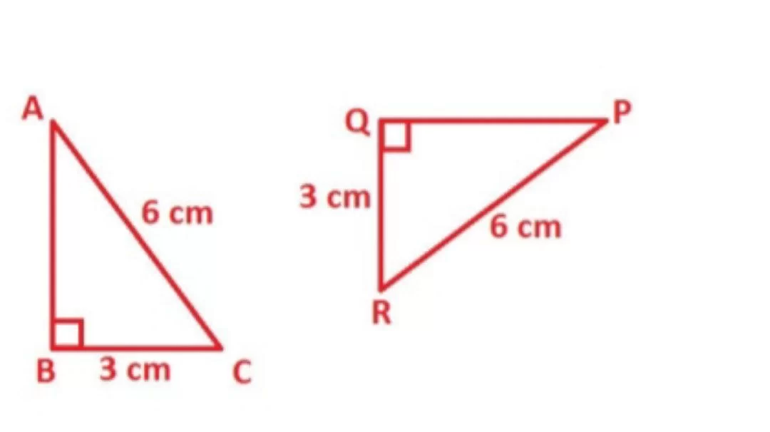 The triangles are right triangles with congruent hypotenuses (6 cm) and one pair of congruent legs (3 cm), satisfying the Hypotenuse-Leg (HL) theorem.