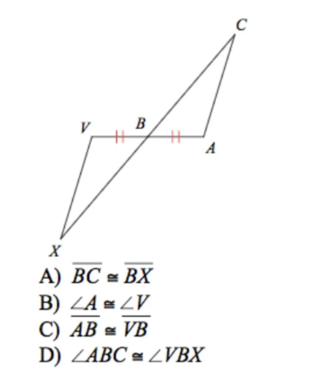 With the marked side AB congruent to VB and the vertical angles at B, adding the congruence of angle A and angle V provides ASA.