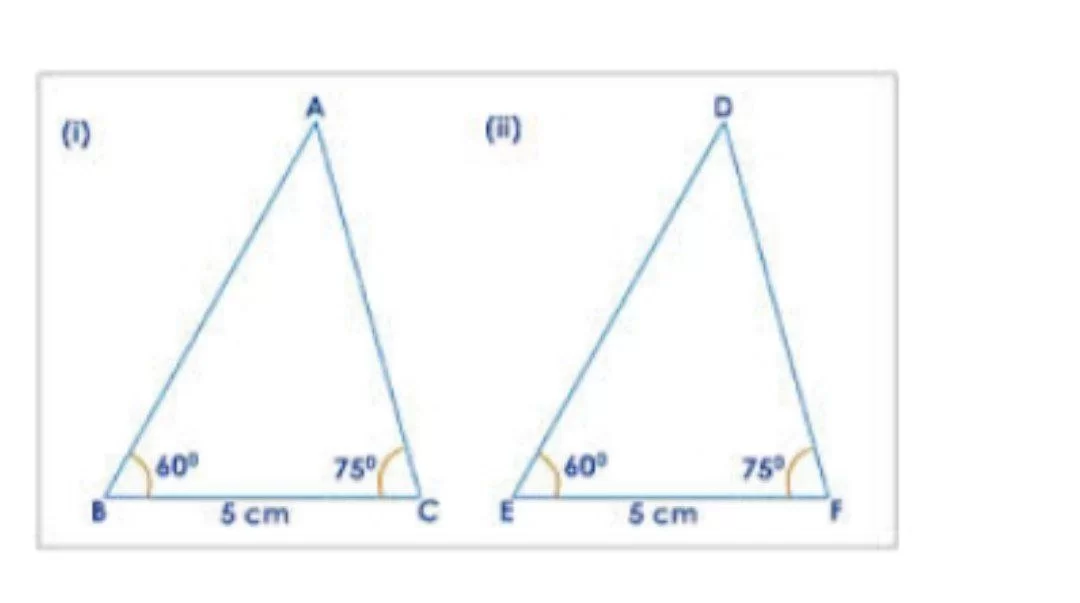 Both triangles have angles of \(60^\circ\) and \(75^\circ\) with the included side of 5 cm being equal, satisfying ASA.