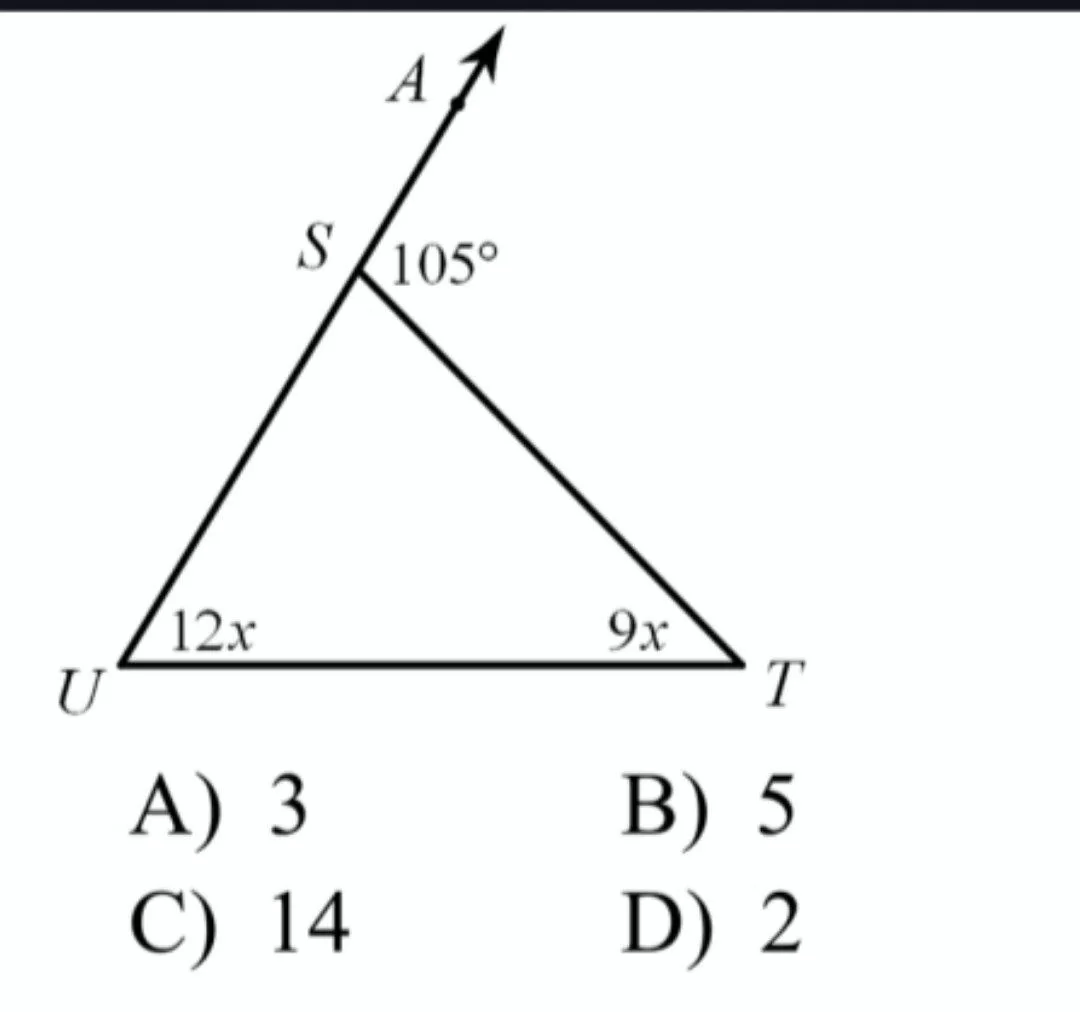 The exterior angle is \(105^\circ\). The remote interior angles are \(12x\) and \(9x\). Thus, \(12x + 9x = 105 \implies 21x = 105 \implies x = 5\).