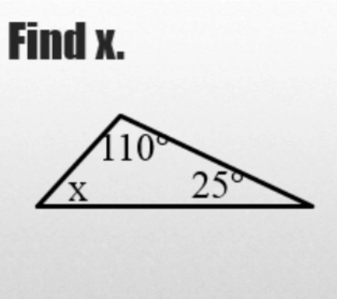 In the triangle shown, the sum of angles is \(180^\circ\). Thus, \(110^\circ + 25^\circ + x = 180^\circ\), which simplifies to \(135^\circ + x = 180^\circ\), so \(x = 45^\circ\).
