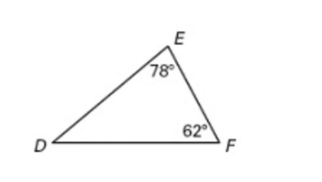 Using the triangle sum theorem, the missing angle D is calculated as \(180^\circ - (78^\circ + 62^\circ) = 180^\circ - 140^\circ = 40^\circ\).