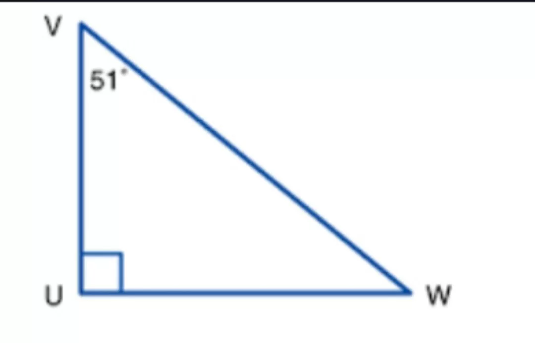 The figure is a \right triangle (indicated by the square symbol at U). Therefore, the missing angle is \(180^\circ - 90^\circ - 51^\circ = 39^\circ\).