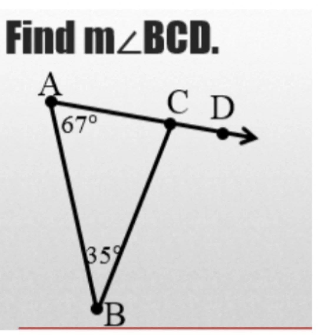 According to the exterior angle theorem, the exterior angle (BCD) is equal to the sum of the two remote interior angles: \(67^\circ + 35^\circ = 102^\circ\).